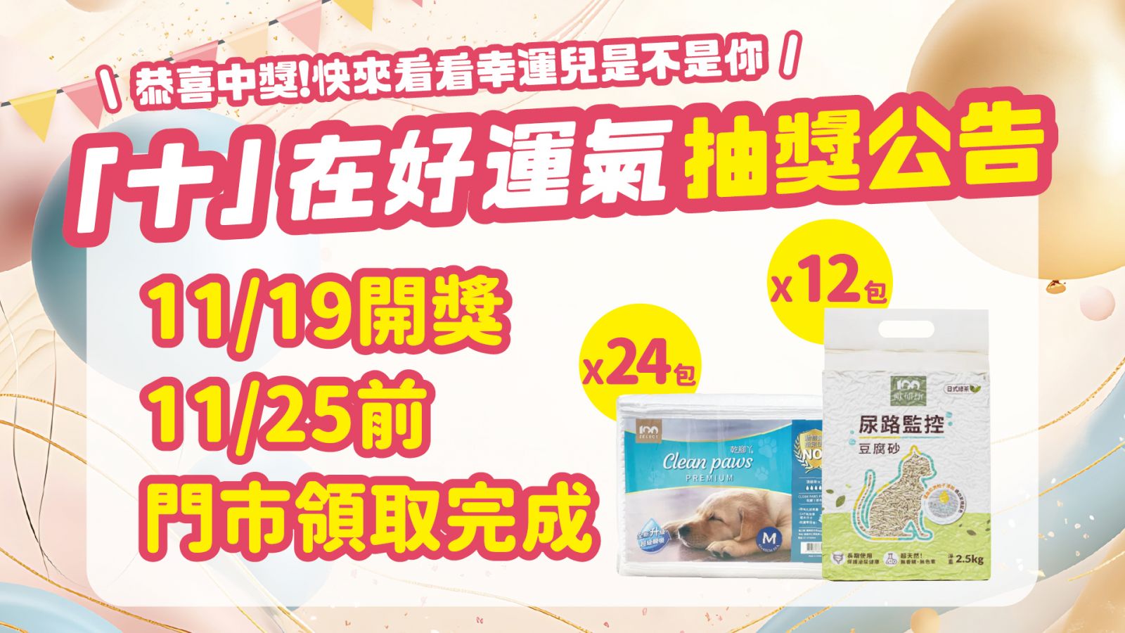 請中獎者於2025/11/19(三)確認開獎,由百分百寵物(總部)確認領獎門市後,在指定時間前往門市領取 (逾時不補)